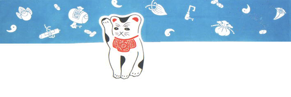 招き猫は、江戸中期から商売繁盛や招福を願い飾られた縁起物です。青地部分に宝づくしの柄がちりばめられています。